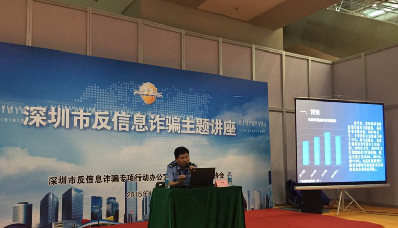 “針對信息詐騙犯罪高發(fā)的態(tài)勢,今年8月1日,我市開展以深圳市政法委書記李華楠同志為領(lǐng)導(dǎo)小組組長的反信息詐騙犯罪專項(xiàng)行動,為期半年。此次專項(xiàng)行動主要集中公安、銀行、通信、工商、網(wǎng)絡(luò)企業(yè)等專業(yè)力量共同打擊信息詐騙犯罪。經(jīng)過合成打擊、宣傳防范、警信警銀合作、對策研究等多個(gè)方面的工作,8月1日至10月25日,全市共立信息詐騙案件環(huán)比下降了13.9%;破信息詐騙案件280宗,環(huán)比260宗上升了7.7%;逮捕涉信息詐騙犯罪嫌疑人190人,環(huán)比149人上升了27.5%;打掉涉信息詐騙犯罪團(tuán)伙19個(gè),環(huán)比19個(gè)持平;凍結(jié)涉案賬戶203個(gè),資金3089.9萬元?!鄙钲谑泄簿中虃删执箨?duì)長朱海在講座上分享道。
