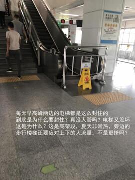 在7月2日的這條投訴中,有市民還指出了電梯停運(yùn)時(shí)間的不合理,稱木棉灣站的地鐵每逢工作日高峰期就“暫停使用”,到了平峰期就正常運(yùn)行。這也引起了其他一些乘客的質(zhì)疑。家住木棉灣站附近的李先生說:“非高峰時(shí)段電梯就能用,說明電梯本身沒問題,那為什么不開放給人多的時(shí)候用呢?”市民張先生則認(rèn)為,地鐵方面可能是為了降低維護(hù)成本,“怕人多踩壞了,要花錢花時(shí)間修唄”。但也有市民猜測電梯停運(yùn)或有安全方面的考慮?!爱吘共粫?huì)無緣無故就停了吧,可能是考慮到高峰客流量多,所以關(guān)掉不用的?!倍排勘硎荆梢越邮芤?yàn)榘踩珕栴}而采取的停運(yùn)措施,“走走樓梯也沒有什么。