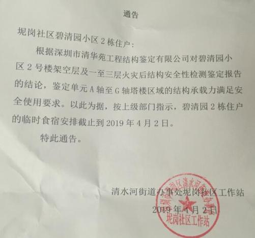 據(jù)記者從坭崗社區(qū)工作站公告了解到,經(jīng)專業(yè)鑒定樓房結(jié)構(gòu)承載力滿足安全使用要求,因此,碧清園2棟住戶的臨時(shí)食宿安排截止到4月2日。對于居民提出的室內(nèi)燒焦氣味的安全問題,通告內(nèi)容未作出解釋。