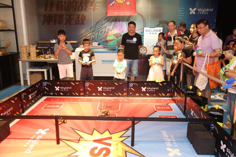 “我跟你說噢,那邊吹出來的泡泡能把我們倆都包進(jìn)去!”“老媽,原來空氣的形狀是圓環(huán)形的呀……”歡聲笑語中,十幾項(xiàng)科技趣味項(xiàng)目讓小朋友們眼花繚亂、目不暇接,這其中,機(jī)器人對(duì)抗賽無疑是人氣最高的。賽場(chǎng)上,小朋友們分為紅藍(lán)兩隊(duì),手持遙控器在兩側(cè)站好?!靶∨笥褌冏⒁饫玻恳晃粰C(jī)器人身上有一個(gè)藍(lán)色燈柱,碰撞擋板被撞到后,燈柱長(zhǎng)度會(huì)縮短……”老師一邊在“戰(zhàn)場(chǎng)”中擺放機(jī)器人,一邊為孩子們?cè)敿?xì)講解規(guī)則。一聲哨響,紅藍(lán)兩隊(duì)的“機(jī)器人大戰(zhàn)”拉開了帷幕,孩子們操控著自己的戰(zhàn)車,左右閃躲,時(shí)而用一個(gè)漂亮的側(cè)移甩掉追擊者,時(shí)而全力沖擊消耗對(duì)方的“藍(lán)條”。賽場(chǎng)邊的家長(zhǎng)們似乎比小選手更為緊張,他們時(shí)不時(shí)俯下身子,為孩子們出謀劃策:“小超你看,邊上那個(gè)三號(hào)車藍(lán)條快沒了,快趕過去補(bǔ)一下!”一位父親看到了打破僵局的好機(jī)會(huì),急忙提醒道,小朋友則心領(lǐng)神會(huì),熟練的操縱著機(jī)器人貼了上去……經(jīng)過一番努力,在成功拿下這寶貴的一分后,小朋友回頭與自己的老爸相視一笑,父子二人之間的默契,在這一刻體現(xiàn)的淋漓盡致。
