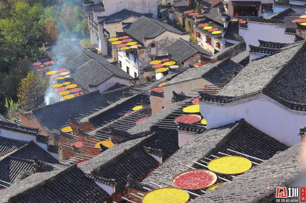 見圳客戶端·深圳新聞網(wǎng)2020年11月25日訊 江西婺源縣篁嶺村獨(dú)特的“曬秋”農(nóng)俗景觀。篁嶺村位于江西省上饒市婺源縣東北部,是著名的“曬秋”文化起源地,也是一座距今近六百年歷史的徽州古村。每當(dāng)日出山頭,數(shù)百棟徽派古民居在百米落差的坡面錯(cuò)落排布,整個(gè)山間村落徽式民居土磚外墻與曬架上五彩繽紛豐收成果組合,繪就出“曬秋”農(nóng)俗特色景觀。