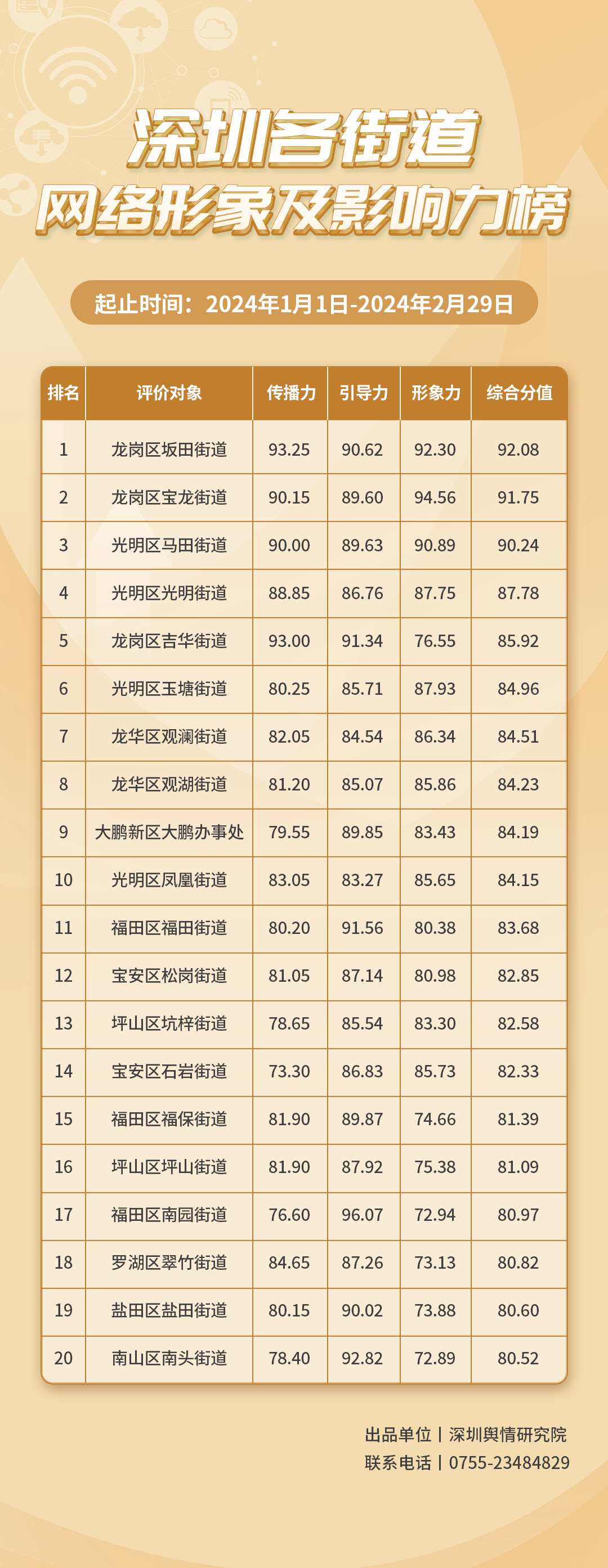 深圳新聞網(wǎng)3月21日訊(記者 王亞男 實習(xí)生 上官新昕) 2024年3月20日,深圳輿情研究院編制推出《深圳各街道網(wǎng)絡(luò)形象及影響力榜》(1-2月期),公布深圳市20個網(wǎng)絡(luò)形象及影響力建設(shè)成效靠前的街道,并指出深入了解各街道的網(wǎng)絡(luò)形象構(gòu)建狀況和社會影響,有助于推動街道治理“提質(zhì)增效”,增加城市高質(zhì)量發(fā)展動能。