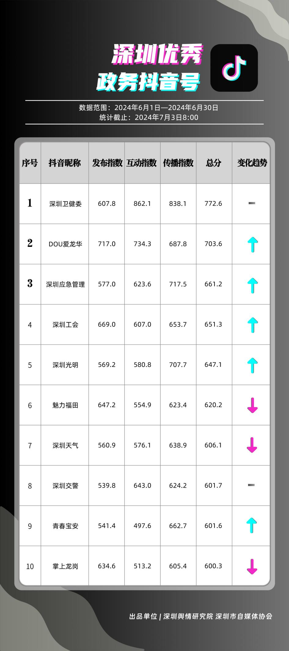 6月,“深圳衛(wèi)健委”“i深圳”“深圳龍崗發(fā)布”“幸福福田”“深圳交通”“深圳教育”“濱海寶安”“創(chuàng)新南山”“深圳工會(huì)”“青春深圳”“同心鵬城”“深圳光明”等30個(gè)政務(wù)微信公眾號(hào),被評(píng)為“深圳優(yōu)秀政務(wù)微信公眾號(hào)”。6月,“深圳衛(wèi)健委”因內(nèi)容策劃出色、受眾互動(dòng)活躍、作品火熱“出圈”等,榮登排行榜首位?!皠?chuàng)新南山”“同心鵬城”“深圳社?!薄吧钲诮逃钡壬习窆娞?hào)也積極創(chuàng)作優(yōu)質(zhì)作品,抓住時(shí)下熱點(diǎn)趨勢(shì),集中發(fā)揮政務(wù)媒體傳播力量,推動(dòng)了政務(wù)信息傳播工作提質(zhì)增效。