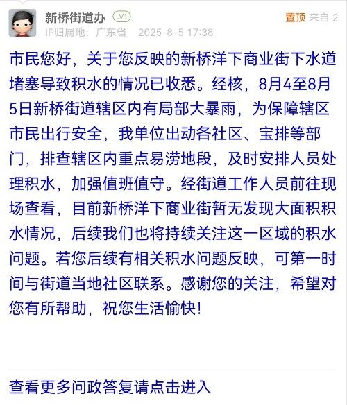 市民您好,關(guān)于您反映的新橋洋下商業(yè)街下水道堵塞導(dǎo)致積水的情況已收悉。經(jīng)核,8月4至8月5日新橋街道轄區(qū)內(nèi)有局部大暴雨,為保障轄區(qū)市民出行安全,我單位出動各社區(qū)、寶排等部門,排查轄區(qū)內(nèi)重點(diǎn)易澇地段,及時安排人員處理積水,加強(qiáng)值班值守。經(jīng)街道工作人員前往現(xiàn)場查看,目前新橋洋下商業(yè)街暫無發(fā)現(xiàn)大面積積水情況,后續(xù)我們也將持續(xù)關(guān)注這一區(qū)域的積水問題。若您后續(xù)有相關(guān)積水問題反映,可第一時間與街道當(dāng)?shù)厣鐓^(qū)聯(lián)系。感謝您的關(guān)注,希望對您有所幫助,祝您生活愉快!