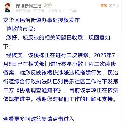 經(jīng)核實(shí),該樓棟正在進(jìn)行二次裝修,2025年7月8日已在相關(guān)部門進(jìn)行零星小散工程二次裝修備案。就您反映該樓棟涉嫌違規(guī)搭建行為,民治街道綜合行政執(zhí)法隊已對民樂社區(qū)工作站下發(fā)第三方《協(xié)助調(diào)查通知書》,目前該事項(xiàng)正在依法依規(guī)推進(jìn)中。感謝您對我們工作的理解和支持。