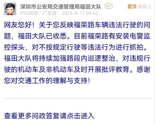 網(wǎng)友您好!關(guān)于您反映福榮路車輛違法行駛的問題,福田大隊已收悉。目前福榮路有安裝電警監(jiān)控探頭,對不按規(guī)定行駛等違法行為進(jìn)行抓拍。福田大隊將持續(xù)加強(qiáng)路段內(nèi)巡邏整治,對違規(guī)行駛的機(jī)動車及非機(jī)動車及時開展批評教育。感謝您對交通工作的理解與支持!