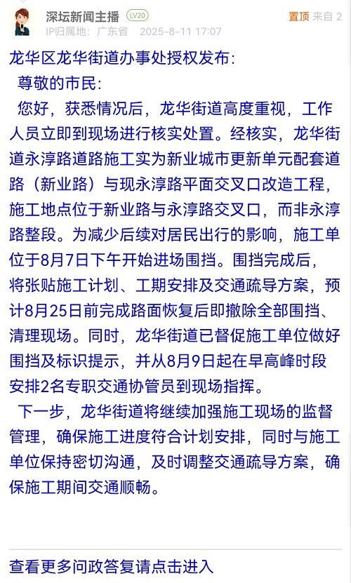 您好,獲悉情況后,龍華街道高度重視,工作人員立即到現(xiàn)場進(jìn)行核實(shí)處置。經(jīng)核實(shí),龍華街道永淳路道路施工實(shí)為新業(yè)城市更新單元配套道路(新業(yè)路)與現(xiàn)永淳路平面交叉口改造工程,施工地點(diǎn)位于新業(yè)路與永淳路交叉口,而非永淳路整段。為減少后續(xù)對居民出行的影響,施工單位于8月7日下午開始進(jìn)場圍擋。圍擋完成后,將張貼施工計劃、工期安排及交通疏導(dǎo)方案,預(yù)計8月25日前完成路面恢復(fù)后即撤除全部圍擋、清理現(xiàn)場。同時,龍華街道已督促施工單位做好圍擋及標(biāo)識提示,并從8月9日起在早高峰時段安排2名專職交通協(xié)管員到現(xiàn)場指揮。