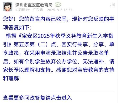 根據(jù)《寶安區(qū)2025年秋季義務(wù)教育新生入學(xué)指引》第五條第(二)點(diǎn),因?qū)嵭泄蚕?、分享、單享政策,在采用電腦錄取結(jié)束并公告錄取名單后,如有個別學(xué)生放棄公辦學(xué)位,無法遞補(bǔ),請家長予以理解和支持。感謝您對寶安教育的支持和理解!