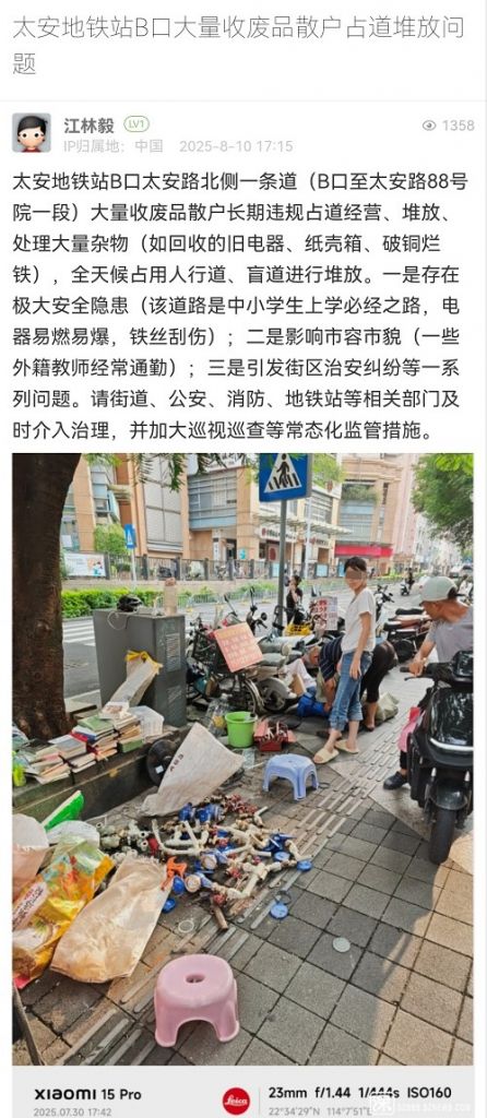 尊敬的市民:您好!您反映的問題我隊已收悉。收到情況后,我隊高度重視,第一時間安排工作人員前往現(xiàn)場核實(shí),相關(guān)處置情況如下:8月11日,我隊工作人員對太安地鐵站B口及周邊開展巡查,暫未發(fā)現(xiàn)占道回收廢品的人員。鑒于流動收廢品人員無固定回收時間和攤位,我隊已安排工作人員在太安地鐵站B口周邊分時段值守,若發(fā)現(xiàn)相關(guān)占道經(jīng)營人員,將立即予以勸離。對于不配合勸導(dǎo)的相關(guān)人員,將予以暫扣經(jīng)營工具等措施。感謝您對城市管理工作的理解與支持!