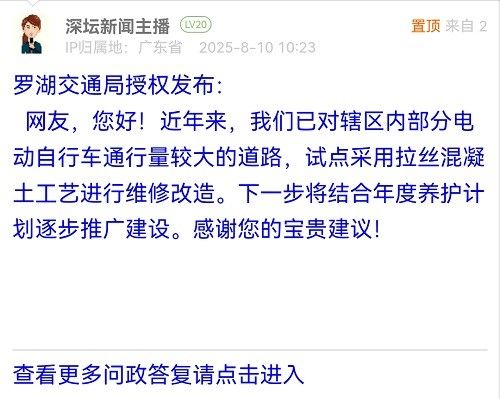 網(wǎng)友,您好!近年來,我們已對轄區(qū)內(nèi)部分電動自行車通行量較大的道路,試點(diǎn)采用拉絲混凝土工藝進(jìn)行維修改造。下一步將結(jié)合年度養(yǎng)護(hù)計劃逐步推廣建設(shè)。感謝您的寶貴建議!