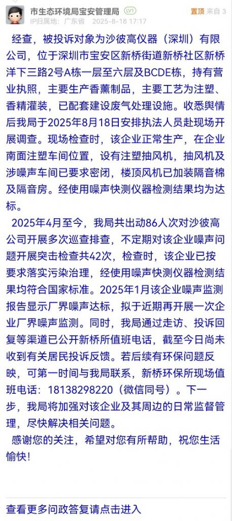 經(jīng)查,被投訴對象為沙彼高儀器(深圳)有限公司,位于深圳市寶安區(qū)新橋街道新橋社區(qū)新橋洋下三路2號A棟一層至六層及BCDE棟,持有營業(yè)執(zhí)照,主要生產(chǎn)香薰制品,主要工藝為注塑、香精灌裝,已配套建設(shè)廢氣處理設(shè)施。收悉輿情后我局于2025年8月18日安排執(zhí)法人員赴現(xiàn)場開展調(diào)查?,F(xiàn)場檢查時,該企業(yè)正常生產(chǎn),在企業(yè)南面注塑車間位置,設(shè)有注塑抽風(fēng)機,抽風(fēng)機及涉噪聲車間已要求密閉,樓頂風(fēng)機已加裝隔音棉及隔音房。經(jīng)使用噪聲快測儀器檢測結(jié)果均為達標(biāo)。