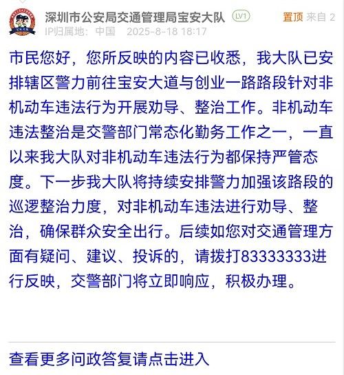 市民您好,您所反映的內(nèi)容已收悉,我大隊已安排轄區(qū)警力前往寶安大道與創(chuàng)業(yè)一路路段針對非機動車違法行為開展勸導(dǎo)、整治工作。非機動車違法整治是交警部門常態(tài)化勤務(wù)工作之一,一直以來我大隊對非機動車違法行為都保持嚴(yán)管態(tài)度。下一步我大隊將持續(xù)安排警力加強該路段的巡邏整治力度,對非機動車違法進行勸導(dǎo)、整治,確保群眾安全出行。后續(xù)如您對交通管理方面有疑問、建議、投訴的,請撥打83333333進行反映,交警部門將立即響應(yīng),積極辦理。
