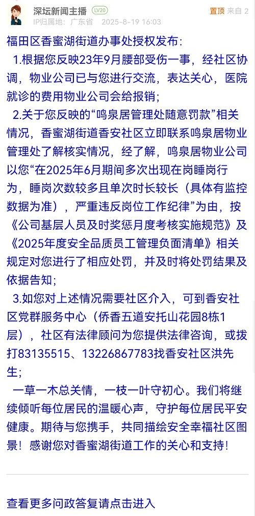 2.關(guān)于您反映的“鳴泉居管理處隨意罰款”相關(guān)情況,香蜜湖街道香安社區(qū)立即聯(lián)系鳴泉居物業(yè)管理處了解核實情況,經(jīng)了解,鳴泉居物業(yè)公司以您“在2025年6月期間多次出現(xiàn)在崗睡崗行為,睡崗次數(shù)較多且單次時長較長(具體有監(jiān)控數(shù)據(jù)為準(zhǔn)),嚴(yán)重違反崗位工作紀(jì)律”為由,按《公司基層人員及時獎懲月度考核實施規(guī)范》及《2025年度安全品質(zhì)員工管理負面清單》相關(guān)規(guī)定對您進行了相應(yīng)處罰,并及時將處罰結(jié)果及依據(jù)告知;