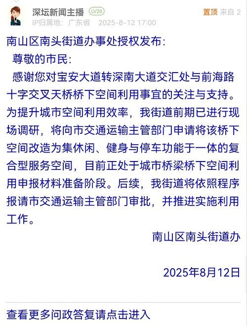 感謝您對寶安大道轉(zhuǎn)深南大道交匯處與前海路十字交叉天橋橋下空間利用事宜的關(guān)注與支持。為提升城市空間利用效率,我街道前期已進行現(xiàn)場調(diào)研,將向市交通運輸主管部門申請將該橋下空間改造為集休閑、健身與停車功能于一體的復(fù)合型服務(wù)空間,目前正處于城市橋梁橋下空間利用申報材料準(zhǔn)備階段。后續(xù),我街道將依照程序報請市交通運輸主管部門審批,并推進實施利用工作。