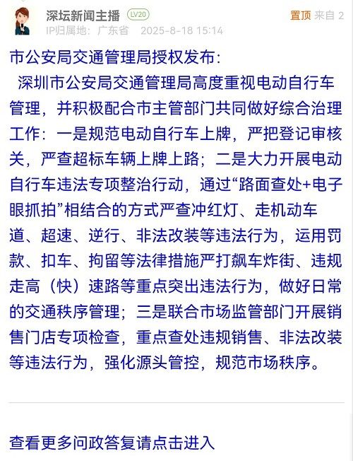 深圳市公安局交通管理局高度重視電動自行車管理,并積極配合市主管部門共同做好綜合治理工作:一是規(guī)范電動自行車上牌,嚴(yán)把登記審核關(guān),嚴(yán)查超標(biāo)車輛上牌上路;二是大力開展電動自行車違法專項整治行動,通過“路面查處+電子眼抓拍”相結(jié)合的方式嚴(yán)查沖紅燈、走機動車道、超速、逆行、非法改裝等違法行為,運用罰款、扣車、拘留等法律措施嚴(yán)打飆車炸街、違規(guī)走高(快)速路等重點突出違法行為,做好日常的交通秩序管理;三是聯(lián)合市場監(jiān)管部門開展銷售門店專項檢查,重點查處違規(guī)銷售、非法改裝等違法行為,強化源頭管控,規(guī)范市場秩序。