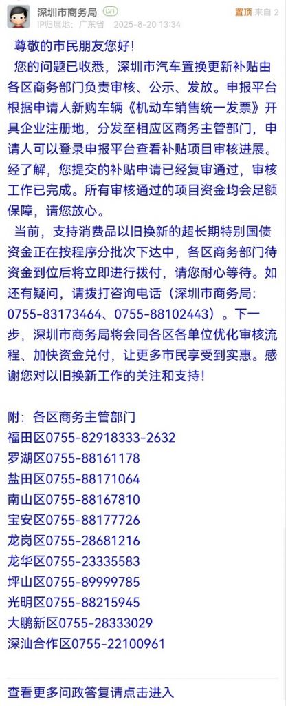 您的問題已收悉,深圳市汽車置換更新補貼由各區(qū)商務(wù)部門負責(zé)審核、公示、發(fā)放。申報平臺根據(jù)申請人新購車輛《機動車銷售統(tǒng)一發(fā)票》開具企業(yè)注冊地,分發(fā)至相應(yīng)區(qū)商務(wù)主管部門,申請人可以登錄申報平臺查看補貼項目審核進展。經(jīng)了解,您提交的補貼申請已經(jīng)復(fù)審?fù)ㄟ^,審核工作已完成。所有審核通過的項目資金均會足額保障,請您放心。