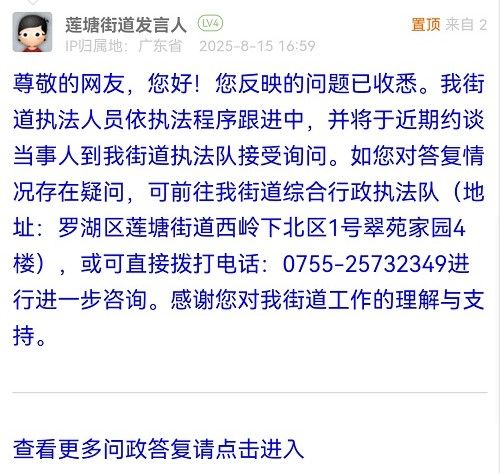 尊敬的網(wǎng)友,您好!您反映的問題已收悉。我街道執(zhí)法人員依執(zhí)法程序跟進中,并將于近期約談當(dāng)事人到我街道執(zhí)法隊接受詢問。如您對答復(fù)情況存在疑問,可前往我街道綜合行政執(zhí)法隊(地址:羅湖區(qū)蓮塘街道西嶺下北區(qū)1號翠苑家園4樓),或可直接撥打電話:0755-25732349進行進一步咨詢。感謝您對我街道工作的理解與支持。