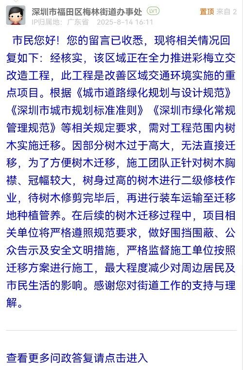市民您好!您的留言已收悉,現(xiàn)將相關(guān)情況回復(fù)如下:經(jīng)核實,該區(qū)域正在全力推進彩梅立交改造工程,此工程是改善區(qū)域交通環(huán)境實施的重點項目。根據(jù)《城市道路綠化規(guī)劃與設(shè)計規(guī)范》《深圳市城市規(guī)劃標(biāo)準(zhǔn)準(zhǔn)則》《深圳市綠化常規(guī)管理規(guī)范》等相關(guān)規(guī)定要求,需對工程范圍內(nèi)樹木實施遷移。因部分樹木過于高大,無法直接遷移,為了方便樹木遷移,施工團隊正針對樹木胸襟、冠幅較大,樹身過高的樹木進行二級修枝作業(yè),待樹木修剪完畢后,再進行裝車運輸至遷移地種植管養(yǎng)。在后續(xù)的樹木遷移過程中,項目相關(guān)單位將嚴(yán)格遵照規(guī)范要求,做好圍擋圍蔽、公眾告示及安全文明措施,嚴(yán)格監(jiān)督施工單位按照遷移方案進行施工,最大程度減少對周邊居民及市民生活的影響。感謝您對街道工作的支持與理解。