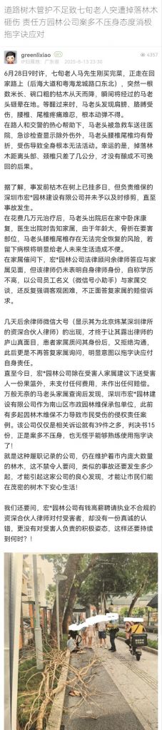 11. 帖文《道路樹木管護不足致七旬老人突遭掉落林木砸傷 責(zé)任方園林公司案多不壓身態(tài)度消極拖字訣應(yīng)對》