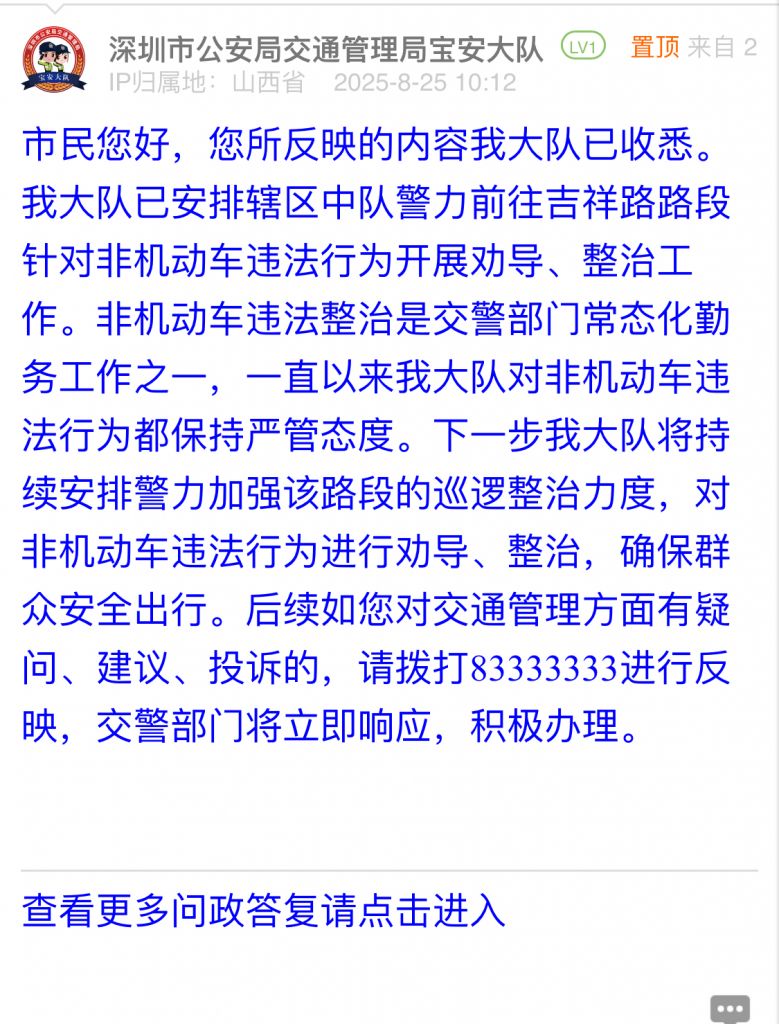 市民您好,您所反映的內(nèi)容我大隊(duì)已收悉。我大隊(duì)已安排轄區(qū)中隊(duì)警力前往吉祥路路段針對非機(jī)動車違法行為開展勸導(dǎo)、整治工作。非機(jī)動車違法整治是交警部門常態(tài)化勤務(wù)工作之一,一直以來我大隊(duì)對非機(jī)動車違法行為都保持嚴(yán)管態(tài)度。下一步我大隊(duì)將持續(xù)安排警力加強(qiáng)該路段的巡邏整治力度,對非機(jī)動車違法行為進(jìn)行勸導(dǎo)、整治,確保群眾安全出行。后續(xù)如您對交通管理方面有疑問、建議、投訴的,請撥打83333333進(jìn)行反映,交警部門將立即響應(yīng),積極辦理。