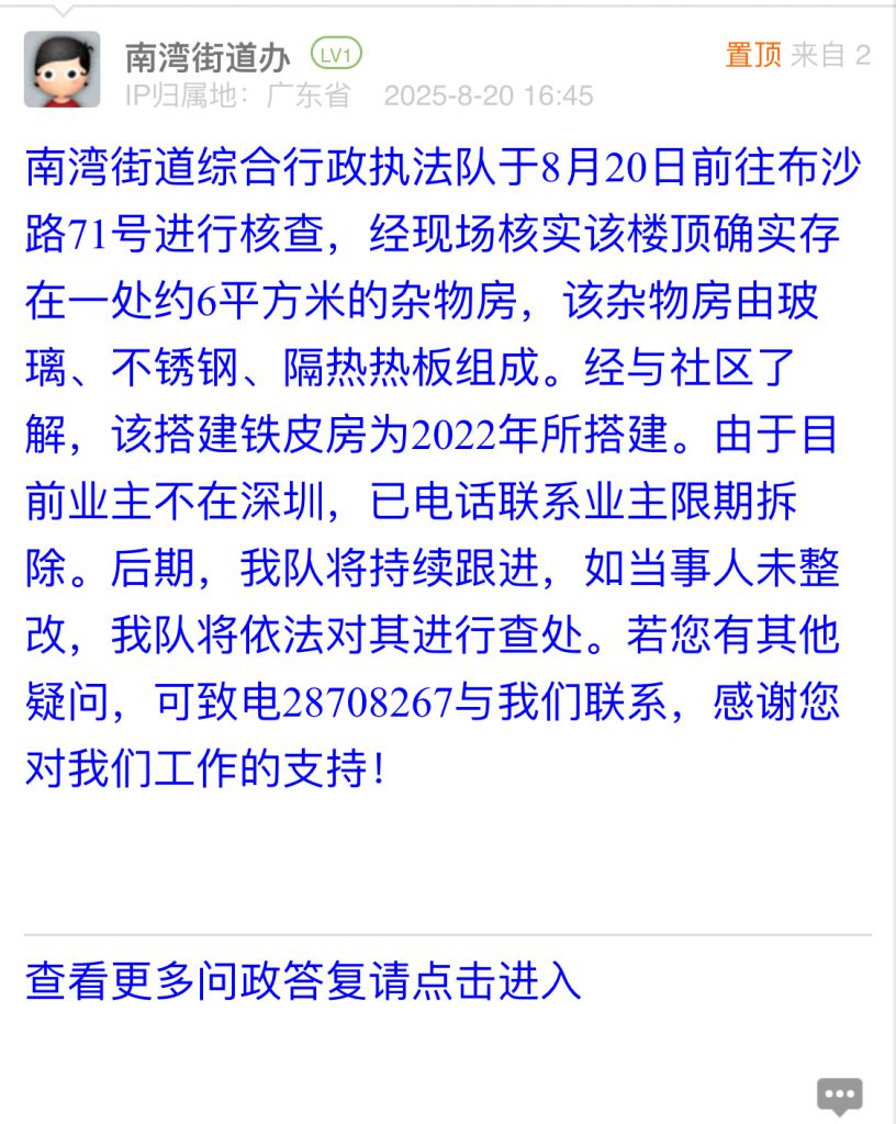 南灣街道綜合行政執(zhí)法隊(duì)于8月20日前往布沙路71號進(jìn)行核查,經(jīng)現(xiàn)場核實(shí)該樓頂確實(shí)存在一處約6平方米的雜物房,該雜物房由玻璃、不銹鋼、隔熱熱板組成。經(jīng)與社區(qū)了解,該搭建鐵皮房為2022年所搭建。由于目前業(yè)主不在深圳,已電話聯(lián)系業(yè)主限期拆除。后期,我隊(duì)將持續(xù)跟進(jìn),如當(dāng)事人未整改,我隊(duì)將依法對其進(jìn)行查處。若您有其他疑問,可致電28708267與我們聯(lián)系,感謝您對我們工作的支持!