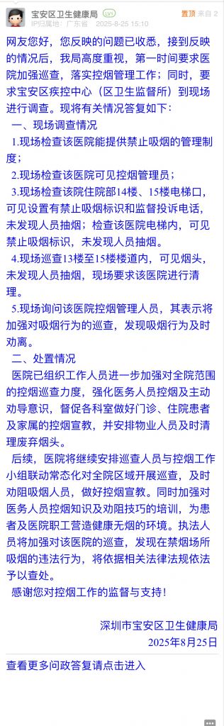 網(wǎng)友您好,您反映的問題已收悉,接到反映的情況后,我局高度重視,第一時間要求醫(yī)院加強(qiáng)巡查,落實(shí)控?zé)煿芾砉ぷ鳎煌瑫r,要求寶安區(qū)疾控中心(區(qū)衛(wèi)生監(jiān)督所)到現(xiàn)場進(jìn)行調(diào)查?,F(xiàn)將有關(guān)情況答復(fù)如下: