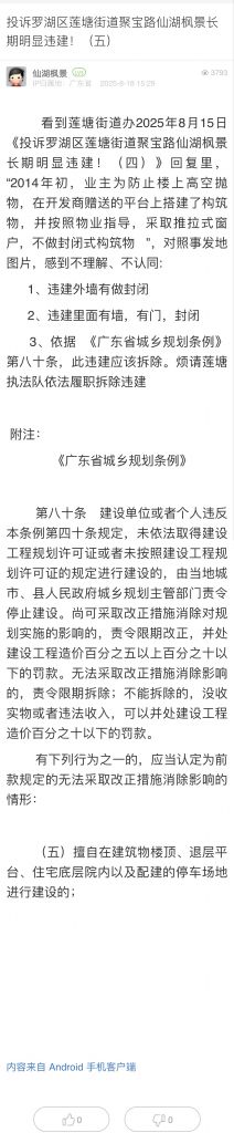 3. 帖文《投訴羅湖區(qū)蓮塘街道聚寶路仙湖楓景長期明顯違建?。ㄎ澹?/a>》
