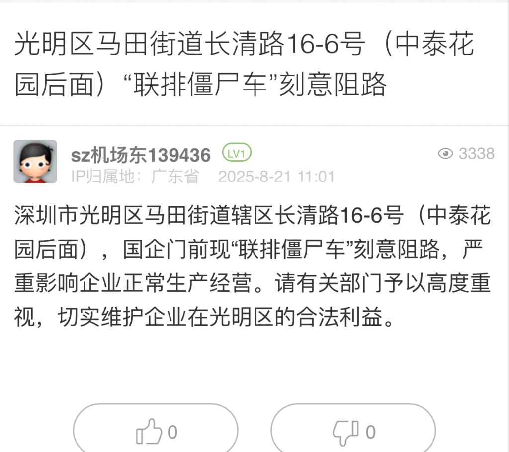 19. 帖文《光明區(qū)馬田街道長清路16-6號(中泰花園后面)“聯(lián)排僵尸車”刻意阻路》