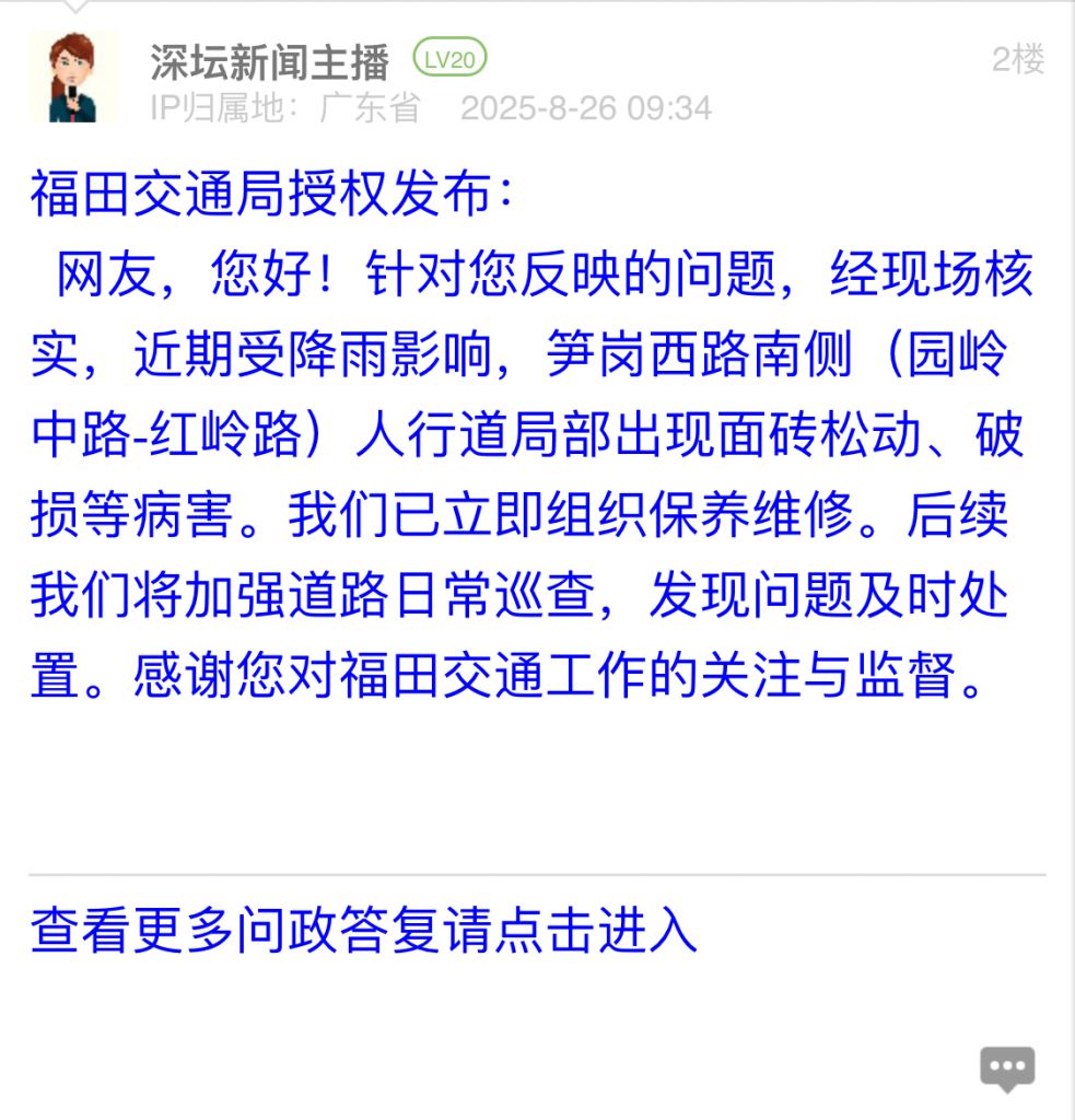 網(wǎng)友,您好!針對您反映的問題,經(jīng)現(xiàn)場核實(shí),近期受降雨影響,筍崗西路南側(cè)(園嶺中路-紅嶺路)人行道局部出現(xiàn)面磚松動、破損等病害。我們已立即組織保養(yǎng)維修。后續(xù)我們將加強(qiáng)道路日常巡查,發(fā)現(xiàn)問題及時處置。感謝您對福田交通工作的關(guān)注與監(jiān)督。