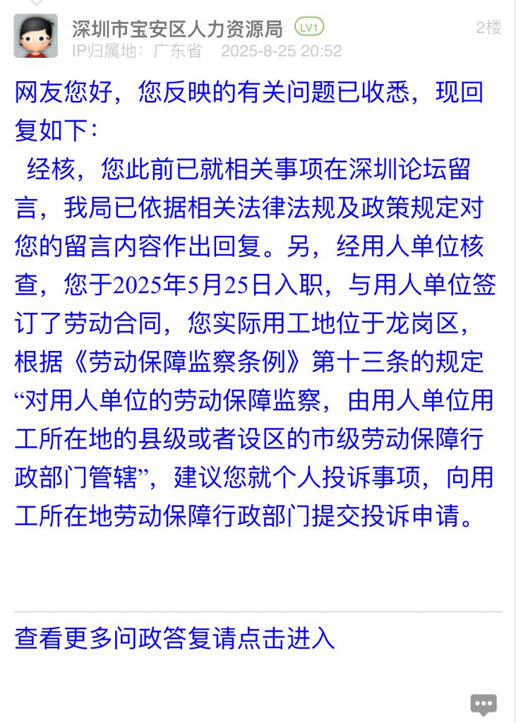 經(jīng)核,您此前已就相關(guān)事項(xiàng)在深圳論壇留言,我局已依據(jù)相關(guān)法律法規(guī)及政策規(guī)定對您的留言內(nèi)容作出回復(fù)。另,經(jīng)用人單位核查,您于2025年5月25日入職,與用人單位簽訂了勞動合同,您實(shí)際用工地位于龍崗區(qū),根據(jù)《勞動保障監(jiān)察條例》第十三條的規(guī)定“對用人單位的勞動保障監(jiān)察,由用人單位用工所在地的縣級或者設(shè)區(qū)的市級勞動保障行政部門管轄”,建議您就個人投訴事項(xiàng),向用工所在地勞動保障行政部門提交投訴申請。