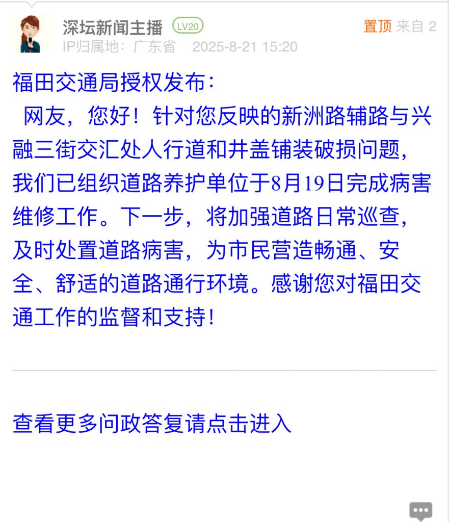 網(wǎng)友,您好!針對您反映的新洲路輔路與興融三街交匯處人行道和井蓋鋪裝破損問題,我們已組織道路養(yǎng)護(hù)單位于8月19日完成病害維修工作。下一步,將加強(qiáng)道路日常巡查,及時處置道路病害,為市民營造暢通、安全、舒適的道路通行環(huán)境。感謝您對福田交通工作的監(jiān)督和支持!