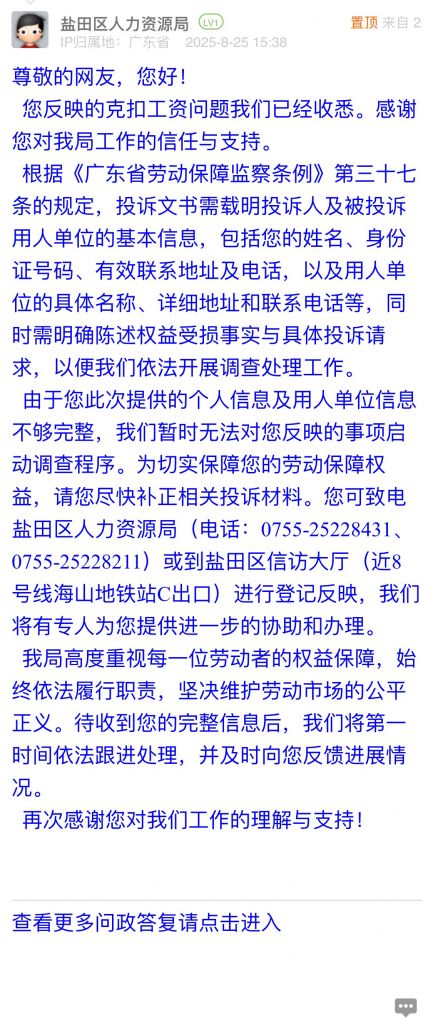 由于您此次提供的個人信息及用人單位信息不夠完整,我們暫時無法對您反映的事項(xiàng)啟動調(diào)查程序。為切實(shí)保障您的勞動保障權(quán)益,請您盡快補(bǔ)正相關(guān)投訴材料。您可致電鹽田區(qū)人力資源局(電話:0755-25228431、0755-25228211)或到鹽田區(qū)信訪大廳(近8號線海山地鐵站C出口)進(jìn)行登記反映,我們將有專人為您提供進(jìn)一步的協(xié)助和辦理。