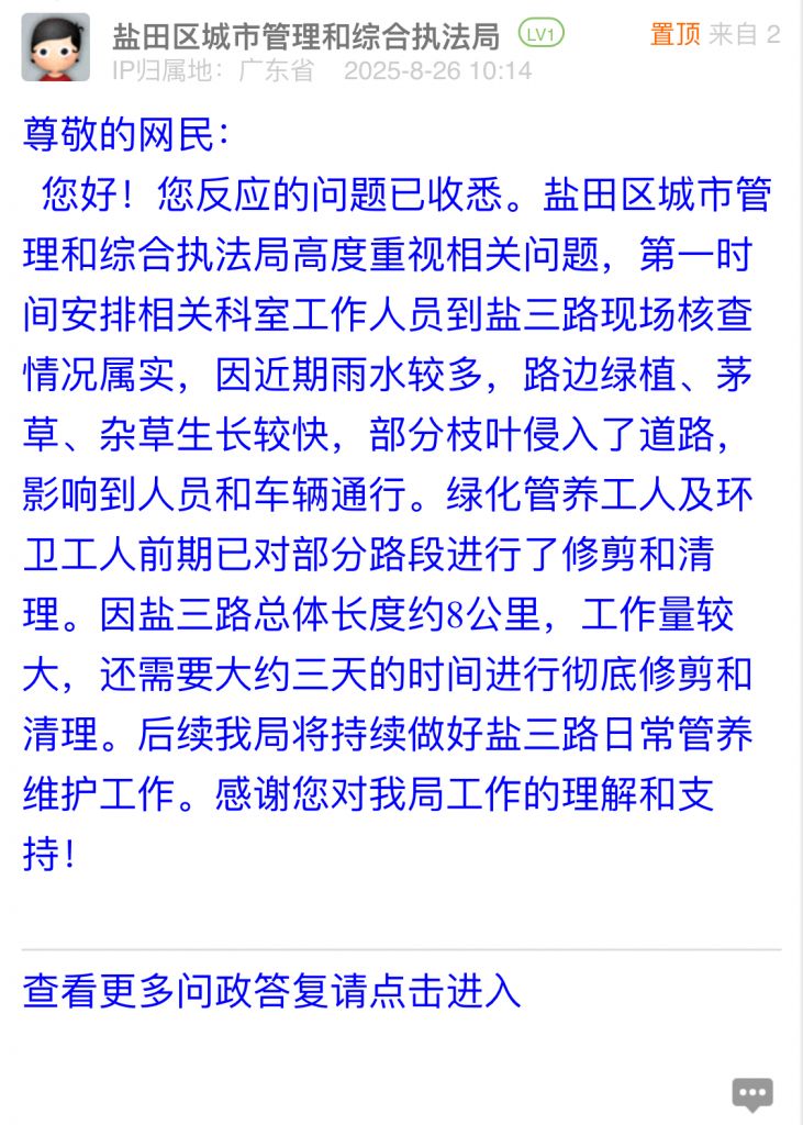 您好!您反應(yīng)的問題已收悉。鹽田區(qū)城市管理和綜合執(zhí)法局高度重視相關(guān)問題,第一時間安排相關(guān)科室工作人員到鹽三路現(xiàn)場核查情況屬實(shí),因近期雨水較多,路邊綠植、茅草、雜草生長較快,部分枝葉侵入了道路,影響到人員和車輛通行。綠化管養(yǎng)工人及環(huán)衛(wèi)工人前期已對部分路段進(jìn)行了修剪和清理。因鹽三路總體長度約8公里,工作量較大,還需要大約三天的時間進(jìn)行徹底修剪和清理。后續(xù)我局將持續(xù)做好鹽三路日常管養(yǎng)維護(hù)工作。感謝您對我局工作的理解和支持!