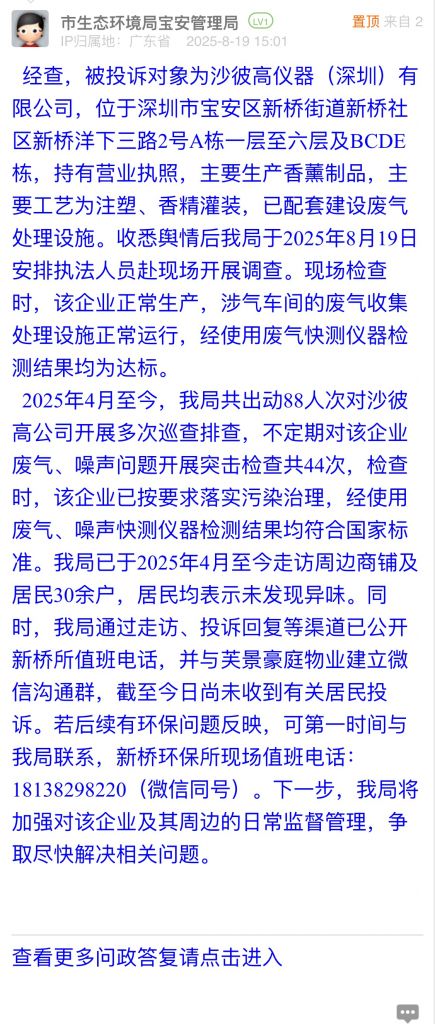 經(jīng)查,被投訴對象為沙彼高儀器(深圳)有限公司,位于深圳市寶安區(qū)新橋街道新橋社區(qū)新橋洋下三路2號A棟一層至六層及BCDE棟,持有營業(yè)執(zhí)照,主要生產(chǎn)香薰制品,主要工藝為注塑、香精灌裝,已配套建設(shè)廢氣處理設(shè)施。收悉輿情后我局于2025年8月19日安排執(zhí)法人員赴現(xiàn)場開展調(diào)查?,F(xiàn)場檢查時,該企業(yè)正常生產(chǎn),涉氣車間的廢氣收集處理設(shè)施正常運(yùn)行,經(jīng)使用廢氣快測儀器檢測結(jié)果均為達(dá)標(biāo)。