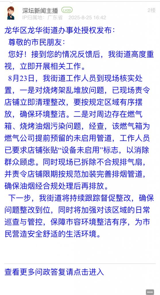 1. 帖文《翠竹街道燒烤店占道經(jīng)營,沒人處理》