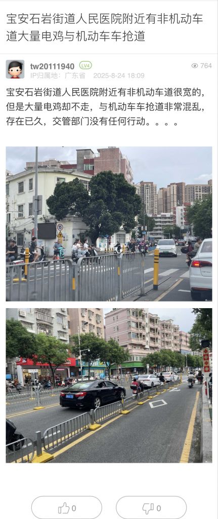 38. 帖文《寶安石巖街道人民醫(yī)院附近有非機(jī)動車道大量電雞與機(jī)動車車搶道》