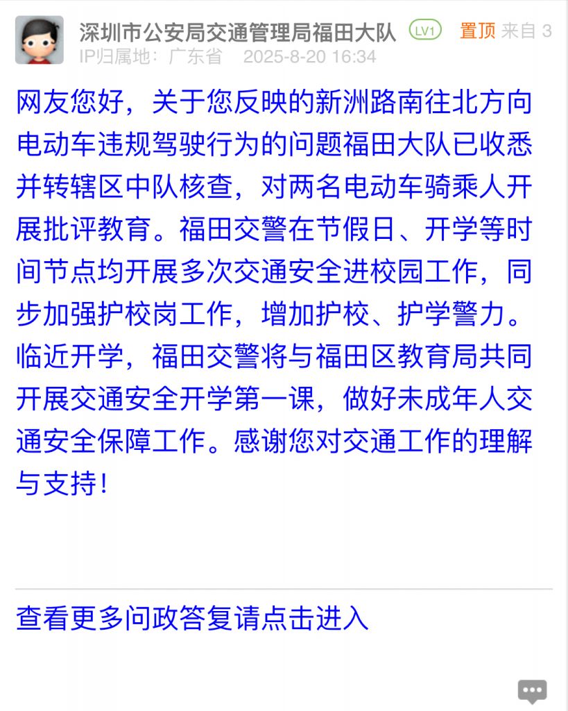網(wǎng)友您好,關(guān)于您反映的新洲路南往北方向電動車違規(guī)駕駛行為的問題福田大隊(duì)已收悉并轉(zhuǎn)轄區(qū)中隊(duì)核查,對兩名電動車騎乘人開展批評教育。福田交警在節(jié)假日、開學(xué)等時間節(jié)點(diǎn)均開展多次交通安全進(jìn)校園工作,同步加強(qiáng)護(hù)校崗工作,增加護(hù)校、護(hù)學(xué)警力。臨近開學(xué),福田交警將與福田區(qū)教育局共同開展交通安全開學(xué)第一課,做好未成年人交通安全保障工作。感謝您對交通工作的理解與支持!