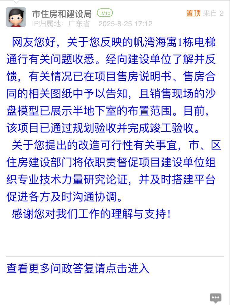 網(wǎng)友您好,關(guān)于您反映的帆灣海寓1棟電梯通行有關(guān)問題收悉。經(jīng)向建設(shè)單位了解并反饋,有關(guān)情況已在項(xiàng)目售房說明書、售房合同的相關(guān)圖紙中予以告知,且銷售現(xiàn)場的沙盤模型已展示半地下室的布置范圍。目前,該項(xiàng)目已通過規(guī)劃驗(yàn)收并完成竣工驗(yàn)收。