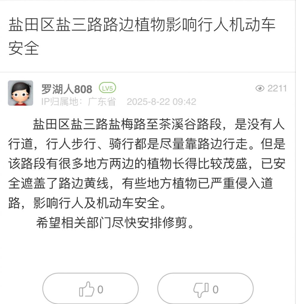 26. 帖文《鹽田區(qū)鹽三路路邊植物影響行人機(jī)動車安全》