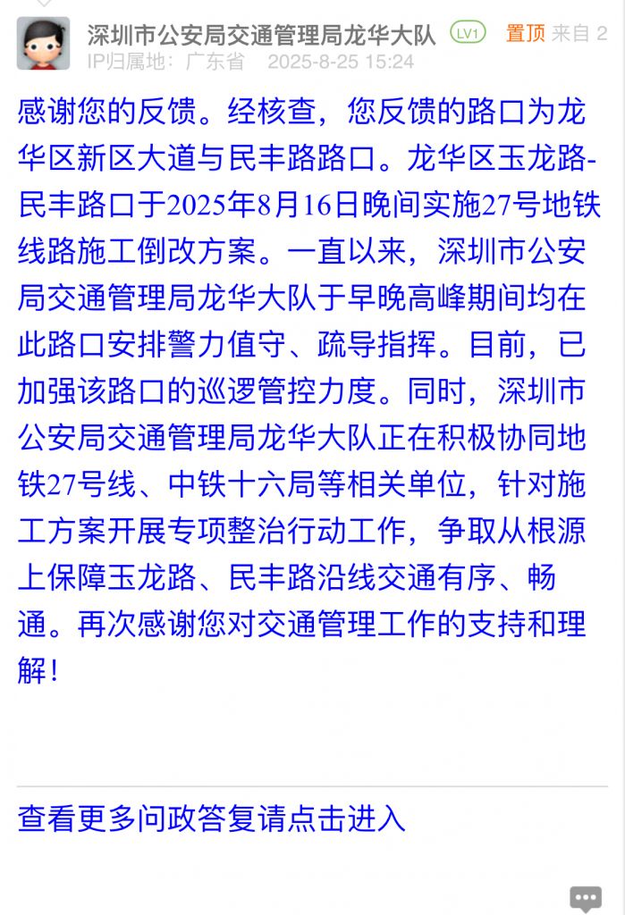 感謝您的反饋。經(jīng)核查,您反饋的路口為龍華區(qū)新區(qū)大道與民豐路路口。龍華區(qū)玉龍路-民豐路口于2025年8月16日晚間實(shí)施27號地鐵線路施工倒改方案。一直以來,深圳市公安局交通管理局龍華大隊(duì)于早晚高峰期間均在此路口安排警力值守、疏導(dǎo)指揮。目前,已加強(qiáng)該路口的巡邏管控力度。同時,深圳市公安局交通管理局龍華大隊(duì)正在積極協(xié)同地鐵27號線、中鐵十六局等相關(guān)單位,針對施工方案開展專項(xiàng)整治行動工作,爭取從根源上保障玉龍路、民豐路沿線交通有序、暢通。再次感謝您對交通管理工作的支持和理解!