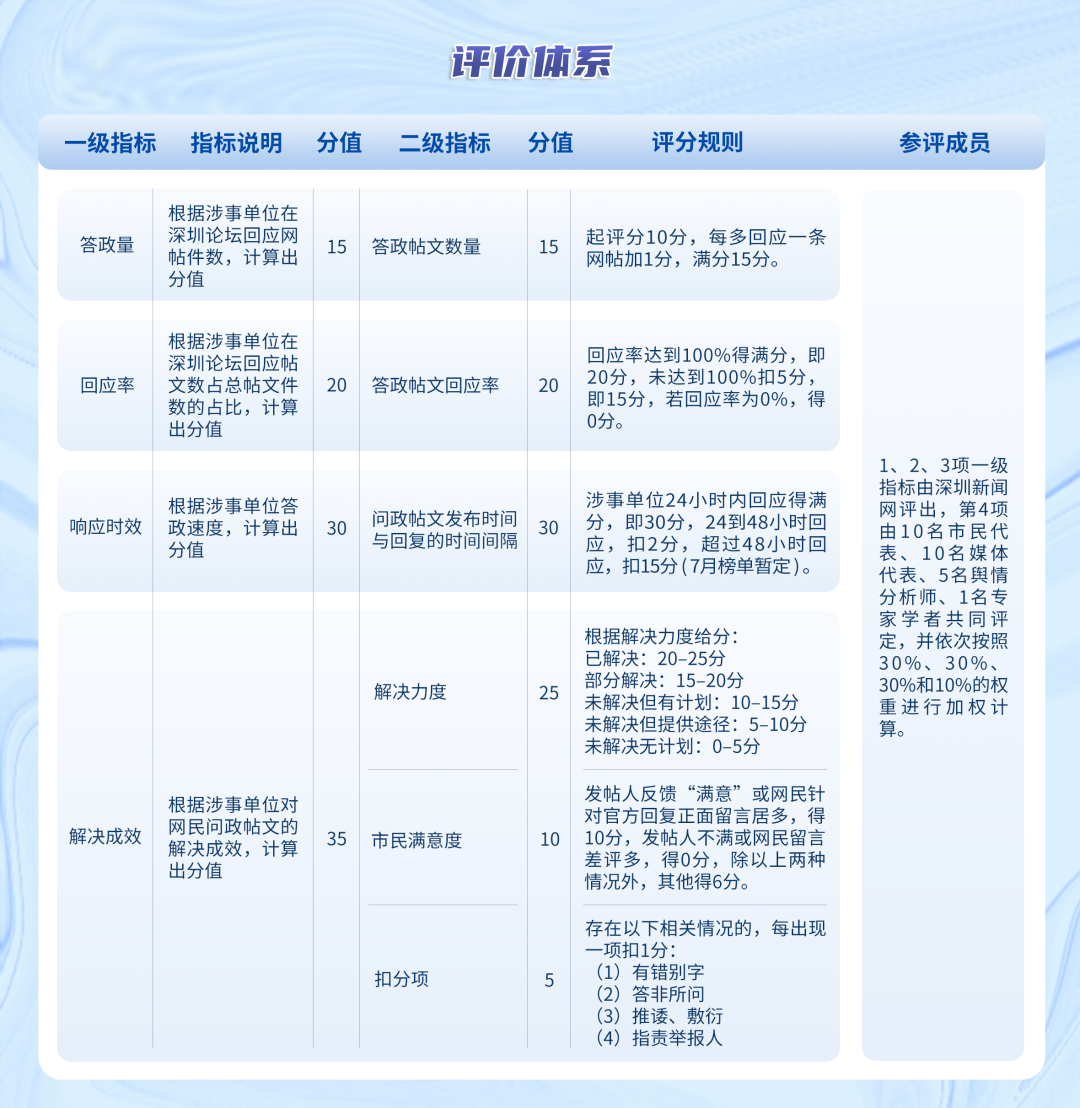 “問(wèn)政深圳紅黑榜”具有科學(xué)、合理、完備的綜合評(píng)價(jià)體系,能夠綜合評(píng)估深圳各級(jí)黨政機(jī)關(guān)和公共企事業(yè)單位的答政情況。