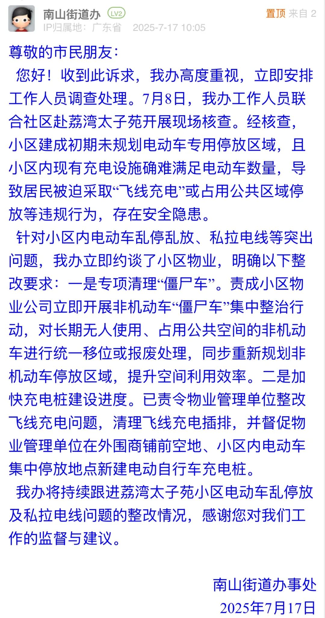 針對(duì)小區(qū)內(nèi)電動(dòng)車(chē)亂停放、私拉電線等存在安全隱患的行為,南山街道辦接訴后迅速聯(lián)合社區(qū)核查,說(shuō)明了歷史規(guī)劃不足的核心病因,通過(guò)約談物業(yè)推動(dòng)整改,從“應(yīng)急響應(yīng)”到“系統(tǒng)治理”的務(wù)實(shí)舉措,回應(yīng)了市民對(duì)消防通道暢通、用電安全的關(guān)切,以“標(biāo)本兼治”的治理思路,為老舊小區(qū)電動(dòng)車(chē)管理提供了可復(fù)制的解決方案。