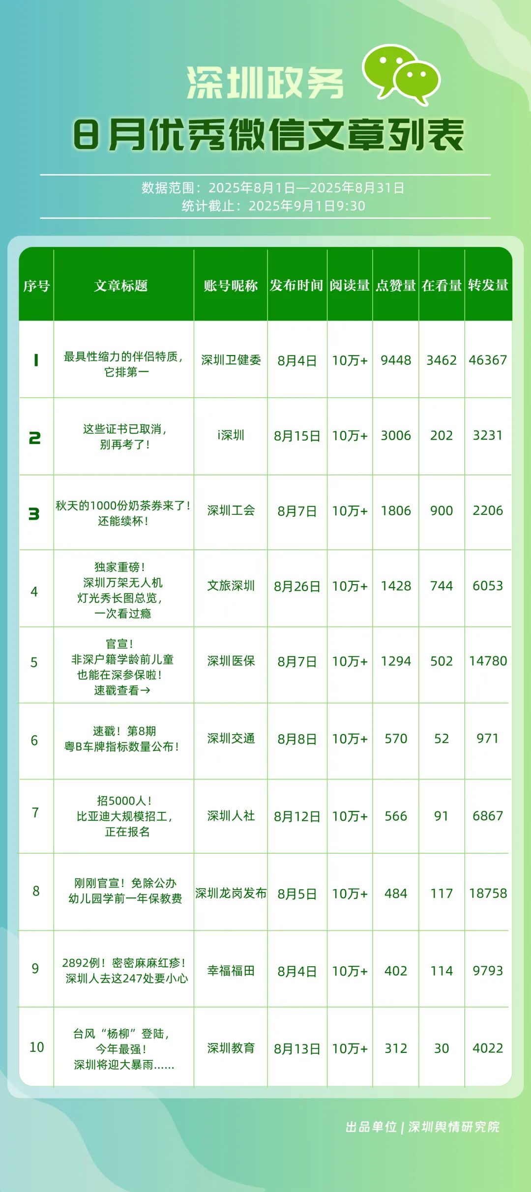 8月,“深圳幸福福田”“深圳消防”“深圳衛(wèi)健委”“創(chuàng)新南山”“深圳人社”“羅湖發(fā)布”“深圳龍崗發(fā)布”“深圳龍華”“青春深圳”“坪山發(fā)布”共10個政務(wù)頭條號入選“優(yōu)秀政務(wù)頭條號”榜單?!吧钲谛腋8L铩睉{借持續(xù)優(yōu)異的綜合表現(xiàn),以滿分成績穩(wěn)居榜單首位,彰顯出強(qiáng)大的政務(wù)傳播力與影響力;“深圳消防”“深圳衛(wèi)健委”則以穩(wěn)定的內(nèi)容質(zhì)量與深厚的民眾基礎(chǔ),持續(xù)為市民提供權(quán)威、及時的服務(wù)信息,排名穩(wěn)固?!皠?chuàng)新南山”“深圳人社”等上榜賬號亦表現(xiàn)亮眼,聚焦民生服務(wù)傳遞政策溫度,共同構(gòu)成政務(wù)新媒體矩陣的中堅力量,為城市治理與民生服務(wù)注入鮮活動能。