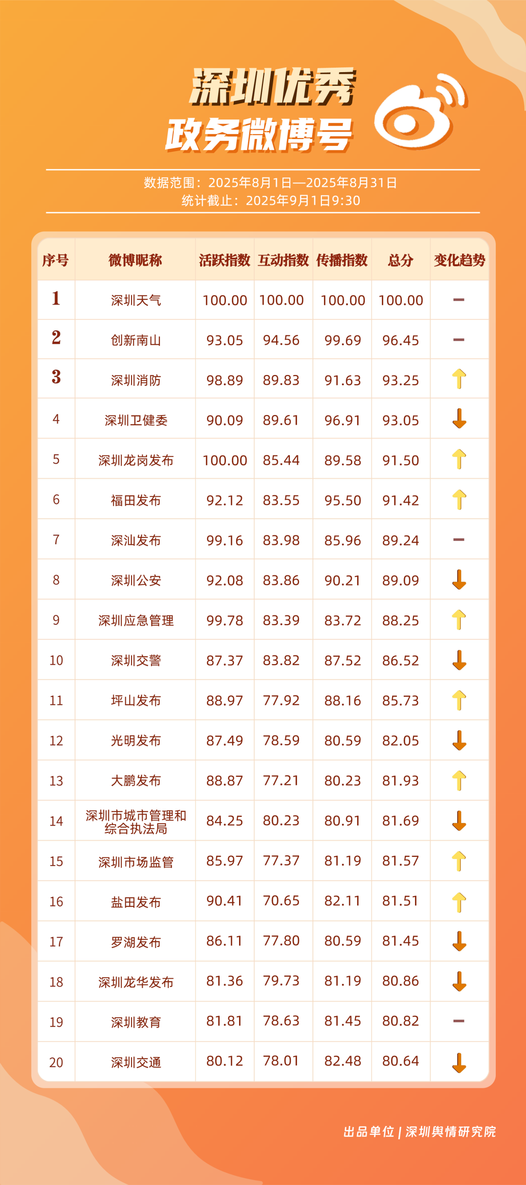8月,“深圳天氣”“創(chuàng)新南山”“深圳消防”“深圳衛(wèi)健委”“深圳龍崗發(fā)布”“福田發(fā)布”“深汕發(fā)布”“深圳公安”“深圳應(yīng)急管理”“深圳交警”等20個賬號入選“優(yōu)秀政務(wù)微博號”。其中,“深圳天氣”持續(xù)以優(yōu)質(zhì)內(nèi)容受到網(wǎng)民肯定,蟬聯(lián)榜首;“創(chuàng)新南山”傳播指數(shù)得分再提升,總分96.45,排名保持在第二位;“深圳消防”積極發(fā)布消防相關(guān)內(nèi)容,以93.25分位列第三。上榜優(yōu)秀政務(wù)微博賬號精準(zhǔn)把握網(wǎng)民興趣點(diǎn),內(nèi)容獨(dú)具風(fēng)采,收獲網(wǎng)民認(rèn)可,實(shí)現(xiàn)了較好的傳播效果。